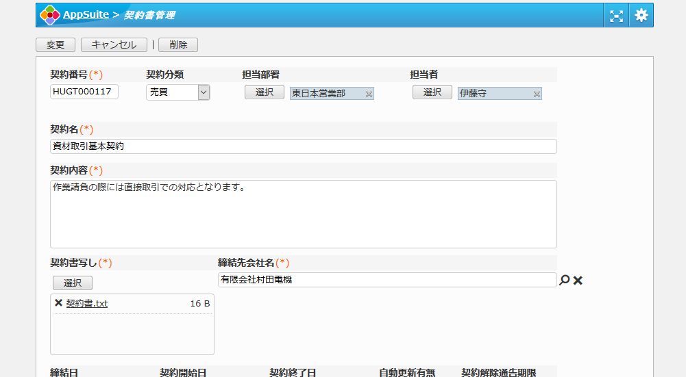 社内、各部署に存在する契約書をここで集約し、一括管理できます。契約書の写しをファイル添付でデータ保存しておくことで、必要な場合にすぐに参照できます。