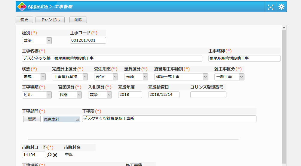 工事管理アプリの案件で、受注した場合に受注情報を管理するアプリです。受注情報は工事コード単位で管理されて、設計変更に伴う金額情報を管理します。