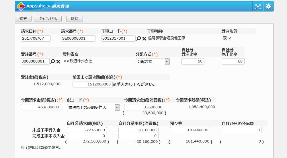 工事コード、工事名称、受注番号、前回まで請求金額、今回請求金額、請求残額、請求金額の内訳(自社分の金額、構成会社の預り金、持ち分変更による分配金)、入金条件