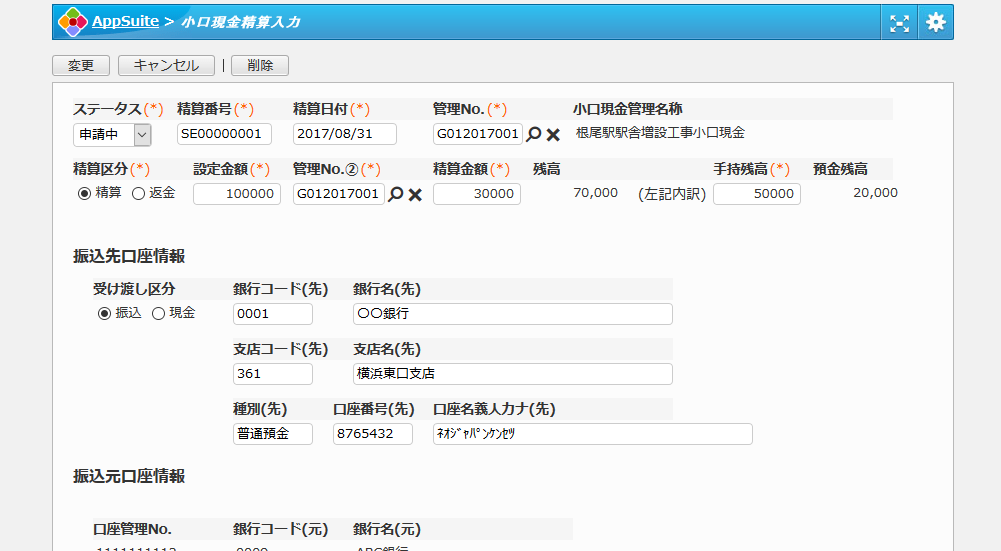 小口現金管理No.、精算金額、残高、振込先および元の口座情報