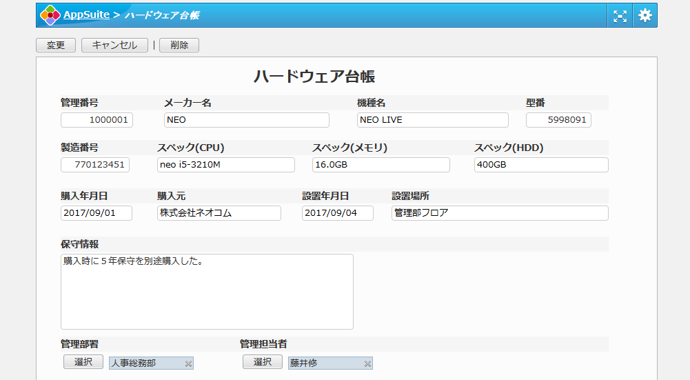 ハードウェアごとの管理部署や管理担当者に関する情報も併せて管理できます。管理担当者の異動があってもスムーズに引継ぎが行えます。