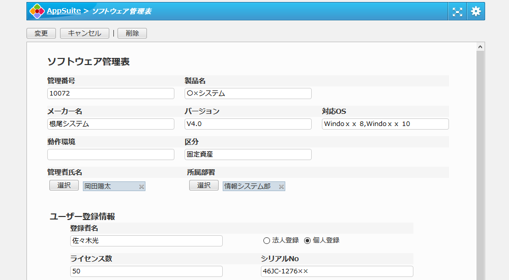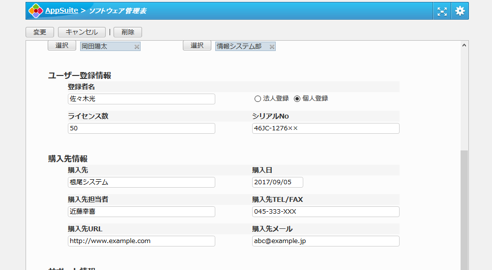 保有ソフトウェア資産に関するユーザー登録や購入元の情報を一元管理できます。管理者の異動があってもスムーズに引継ぎが行えます。