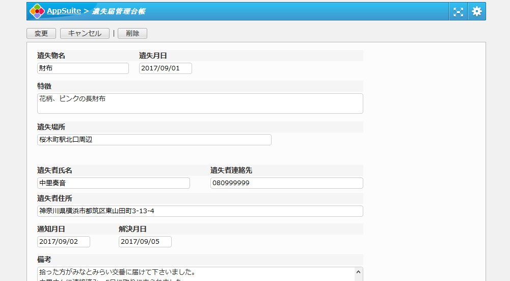遺失物、遺失日、遺失者、遺失場所、解決日