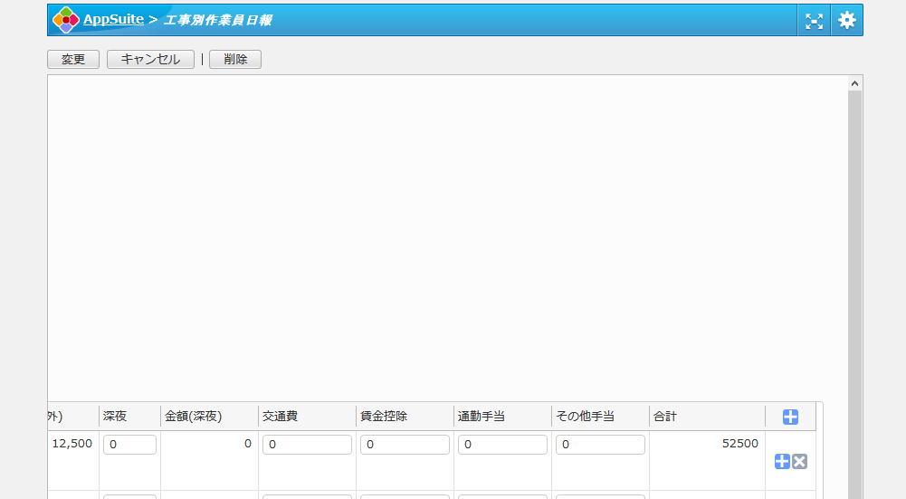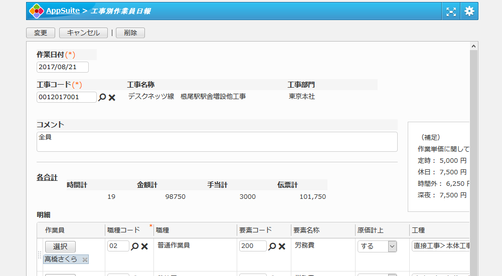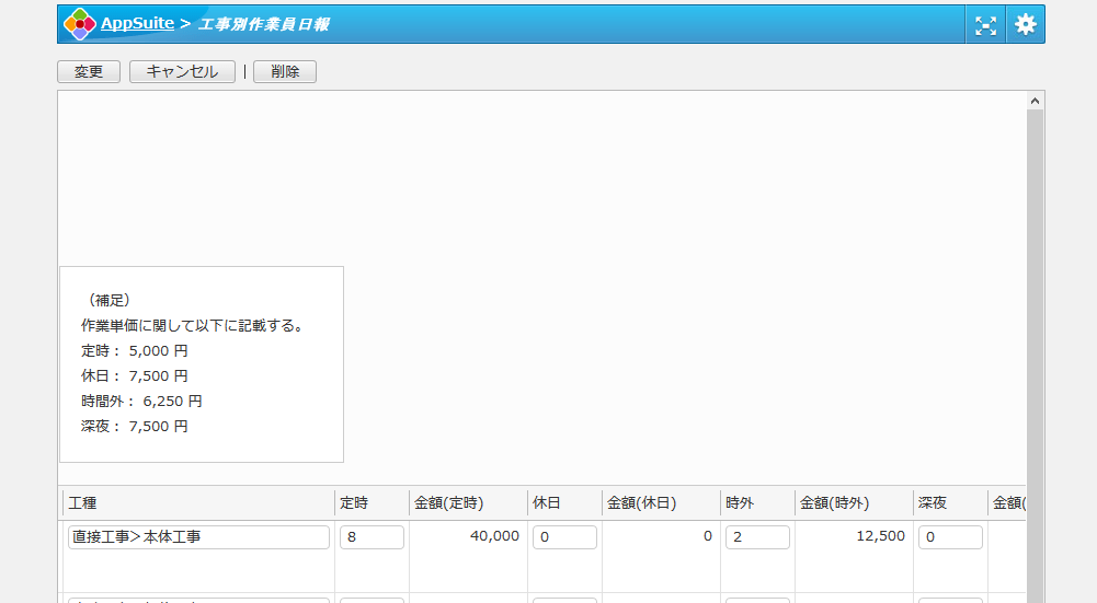 工事単位で、従事した作業員の日々の直課および経費等の工事原価を登録する形式です。