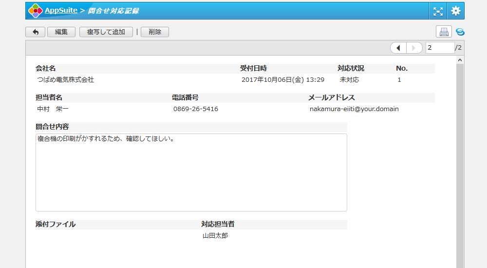 お客様からの問合せ内容と対応履歴を管理するアプリです。