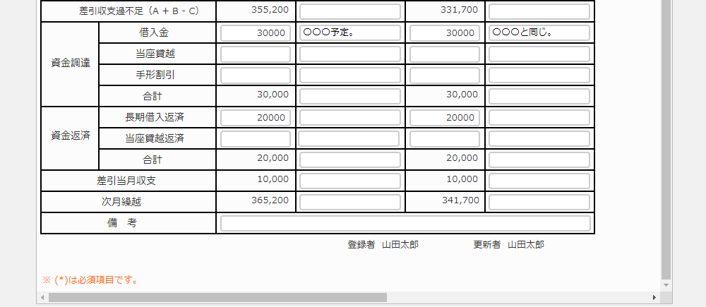 起票日、前月繰越金、営業収入、営業支出、資金調達、資金返済