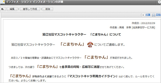 職員は訪問先などへの外出が多く、以前は紙のレジュメが滞ってしまうことも多かったが解消された。さらに、会議の日程調整やイベントへの出欠、各種事業計画や提案に対する意見などに活用。会議資料はここで事前配布し、議事進行の効率化をはかっている。応用範囲が広く、職員のアイデアで便利に使いこなせるため、利用度が高い。