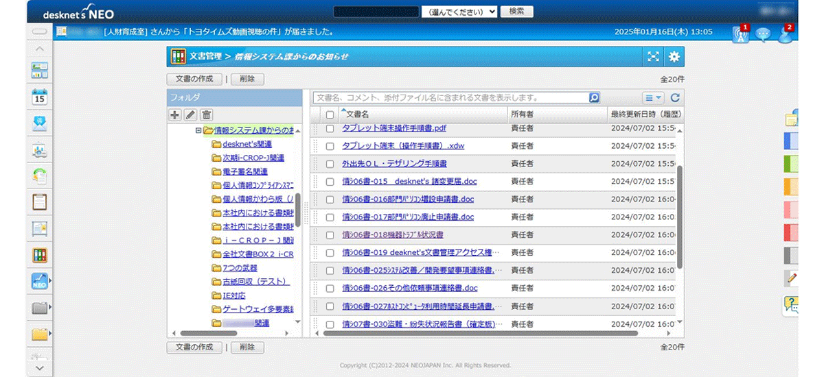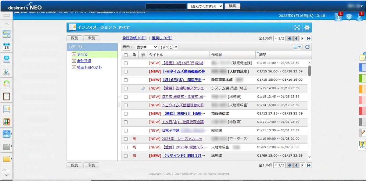 desknet’s NEOの導入はスムーズでした。オンライン研修を何回か実施し、後日、アーカイブ配信も行いました。グループ内に一気に導入したのではなく、職種ごとに少しずつ導入していきましたが、そこでユーザーからあった問い合わせについてインフォメーション機能にQ&A形式で掲載するようにしました。