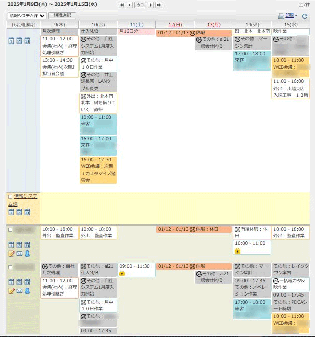 また、櫻井様自身はスケジュールを色分けして管理しています。例えば、ウェブ会議にはオリジナルの色を設定し、備忘録としてグレーを使用することで、過去の業務内容を振り返りやすくしています。色分けを始めてから、業務の切り替えもしやすくなったと語っています。このようにdesknet's NEOでは、各予定に色を設定することで、内容別に視覚的な区別が可能です。これにより、後から予定を把握しやすくなる効果が期待できます。