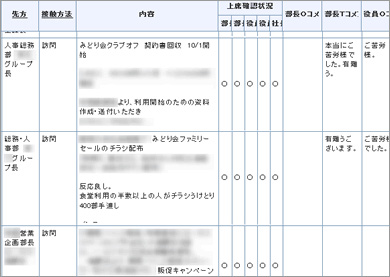 「いつ・どの担当者が・どこの企業の・誰に会って・どのような面談内容だったのか」を「1営業訪問1データ」で共有して、東京・大阪の上職者や役員がチェックとコメントを入れるというシンプルなものですが、desknet's DBなら、やりたい事がすぐ実現できてしまうんですね。各訪問記録を見ながら、かつて担当していた者や顧客と面識がある上職者などが同行するなど、組織横断的な営業活動が進行しています。