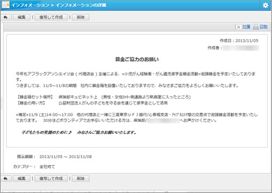 社内のオフィシャルな告知事項に利用。現在は、管理系の一部の人間が発信しているが、メジャーバージョンアップでインフォメーションの権限が設定できるようになったので、今後の社内ニーズに応じて利用度を拡大してゆく予定。