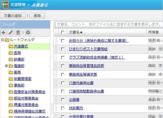 院内で使用する文書、「身上異動届」「物品の購入」「交替表」「慶弔関係」などの書式、様式をすべて共有。原本管理が徹底でき、更新もしやすい。つねに最新の書式で申請することが徹底された。