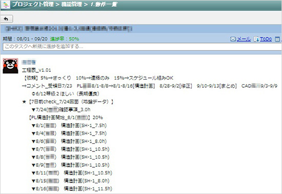 スケジュールと紐付けて[プロジェクト管理]も連携してフル活用しています。スケジュール画面にあるURLをクリックするとプロジェクト管理画面が呼び出され、進捗の登録や報告をシームレスに行っています。