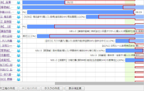 各プロジェクトの[スケジュール]と連携して活用。[スケジュール]上のURLからプロジェクト管理画面にリンクし、進捗登録や報告をシームレスに実行。日々の進捗率を記入するルールの徹底で、複数案件をこなす社員の仕事量が適正に配分できるようになった。
