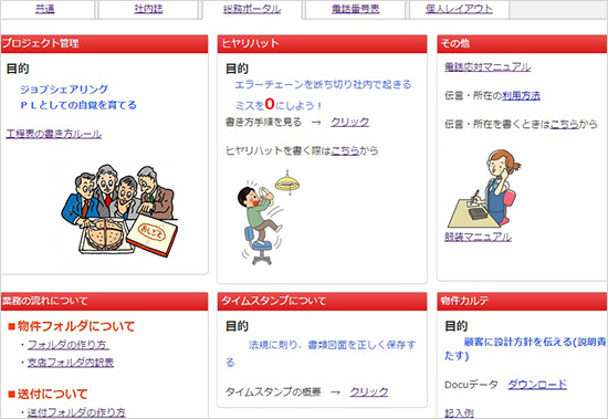 業務や接遇などの各種マニュアルのほか、取引先一覧を管理・表示し迅速にインターネット電話で発信できるようにしている。取引先担当者の最新電話番号・所属部署・役職の最新情報をつねに全社で共有している。