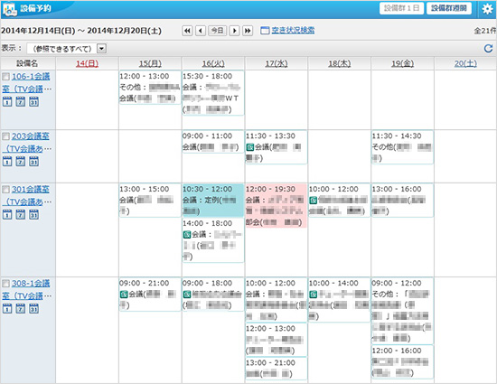 会議室の管理をメインに、公用車3台、プロジェクター、テレビ会議システム(会議室と同時に予約)などの運用管理にフル活用している。 -