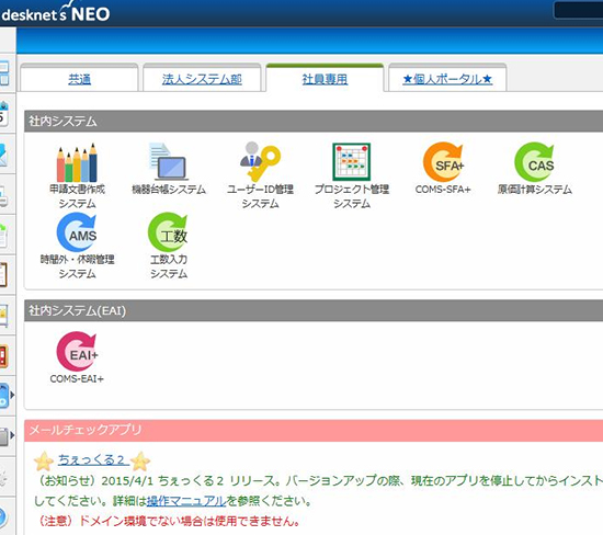 現在、相当数の社内システムがdesknet's NEOを介して縦横無尽に活用されています。