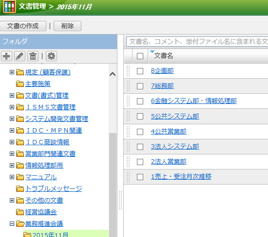 [文書管理]で会議資料の共有をはじめました。役員の定例会議が毎週開かれるのですが、今まで紙の資料で配付していたものを[文書管理]で事前共有して会議の場ではノートPCで閲覧するようにしたのです。決して少なくないページ数の資料を会議のたびに人数分用意していたものがゼロになりました。当初は会議システムの導入なども検討しましたが、資料共有には日々活用しているdesknet's NEOのほうが使いやすくコストもかかりません。計測はしていませんがペーパーレス化の効果は非常に高いため、部課長クラスの会議などにも展開しています。