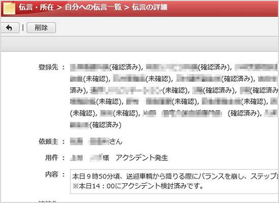 アクシデント、インシデント関連の事案をいち早く共有するために活用。「ヒヤリハット」など、何かあったらまず[伝言・所在]に必ず入力し、シフトで職場に入ったら必ずチェックするというルールが職員間で周知徹底されている。