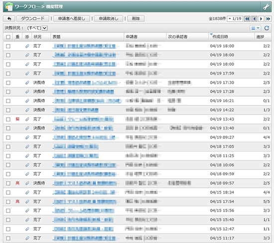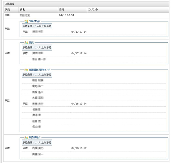 技術営業〜製造間の各種申請に活用され、1日平均20件の申請書類が扱われる。多品種小ロット生産、個々の製品要求に着実に応え迅速な製造対応を実現する、業務に欠かせない活用度の高い機能として進化・定着。