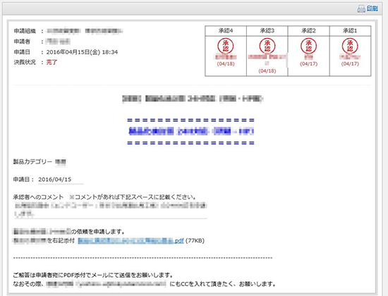 出先や出張先からも申請可能ですし、今までやむなく担当者間で直接やりとりしていた緊急対応の案件も、すべて上長の承認を得てから製造部に依頼されるようになりました。