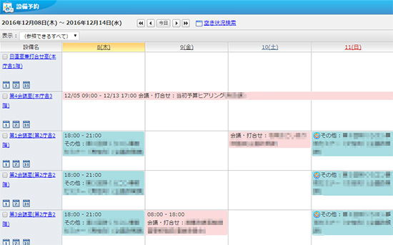 会議室10室、備品(プロジェクタ、カーナビ)5点、公用車輌10台を一括管理。