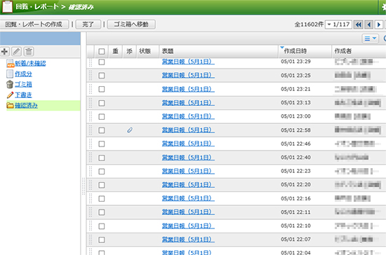 以前の書式項目をそのまま [回覧・レポート]の書式として用意しました。ファクス送信の手間もなくなり、短期間で活用も定着したようです。現在では各店舗の1日の売り上げ、店長コメント、1日の出来事、来店客数、部門別の売り上げ、本やCDの売り上げベスト、注目すべき商品など、日々の営業に役立つ報告が全店で確認できるようになり、他店の状況もわかるようになりました。書店経営にとって重要な「数値・情報・報告」の3要素がその日のうちに共有できるようになった効果は大きいですね。