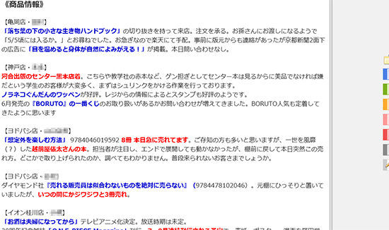 店舗の売り上げ以外にも、セールス上重要な情報が集まるようになっていました。各店長のコメントや店舗からの報告、売れ筋商品ランキング、どのような商品・書籍が急に売れ始めているかなど、書店員ならではの直感が活かされた販売促進に直結する有益情報が日々上がっていました。
