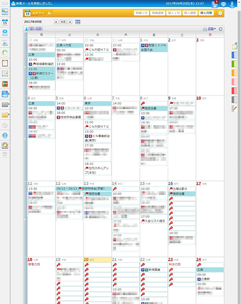 desknet's NEOの社内定着にも貢献している機能(詳細は本文)。各社員の予定、たとえば営業の訪問日程や会議・打ち合わせなどの共有、およびスケジューリングに活用されている。セキュリティの観点から、役員クラス以上のスケジュールにはアクセス権を設定し、限られた人のみが閲覧可能な状態となっている。