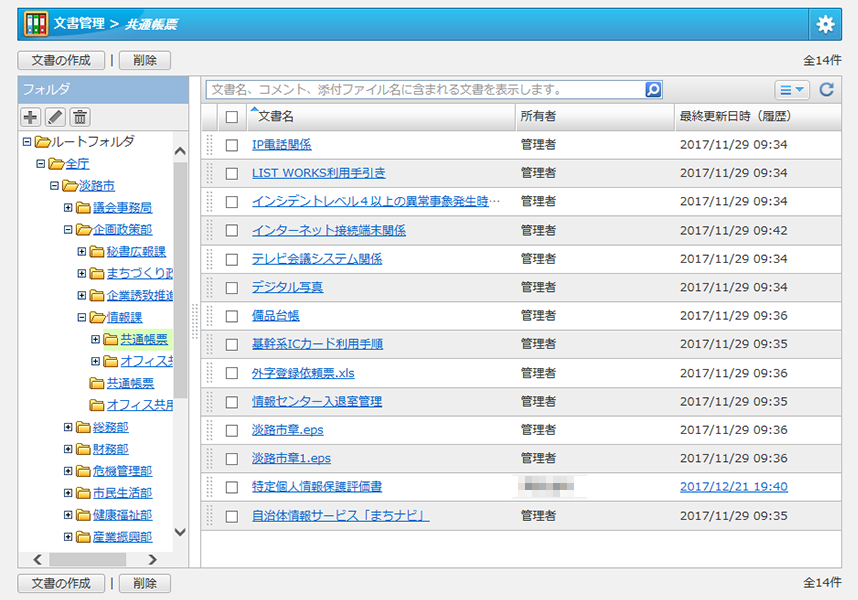 庁内共有ファイルサーバーの位置づけで、部課ごとのファイル共有や保管庫としてフル活用。「共通帳票」は全職員、全庁的に活用する帳票類に、「オフィス共用」はアクセス権を設定して部内・課内の配下の職員で共有。