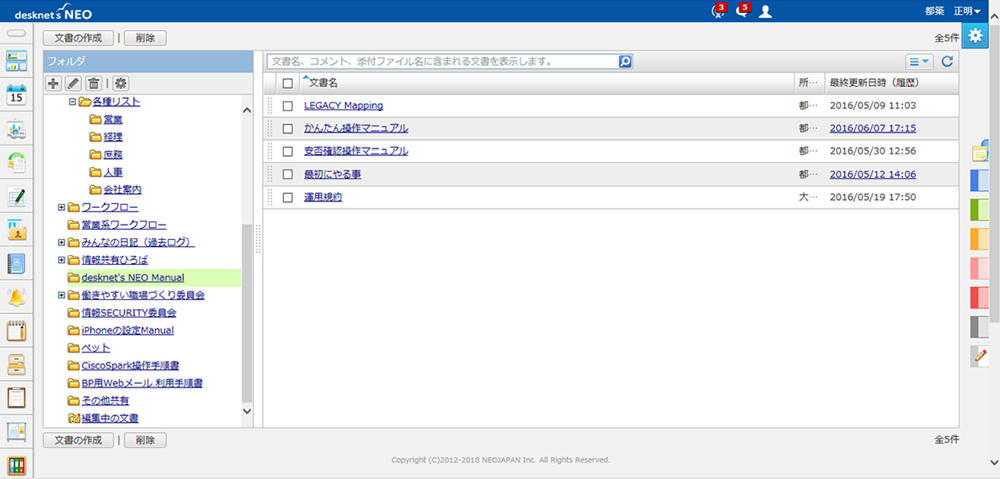 社内の規定や規約の書類はもちろん、desknet's NEOの利用マニュアルも保存されている。同マニュアルは、ネオジャパン作成の「かんたん操作マニュアル」をもとに独自に制作されたもの。実際の利用シーンに合わせてマニュアルは活用でき、NEO活用のサポート拠点として本機能自体も運用されている。