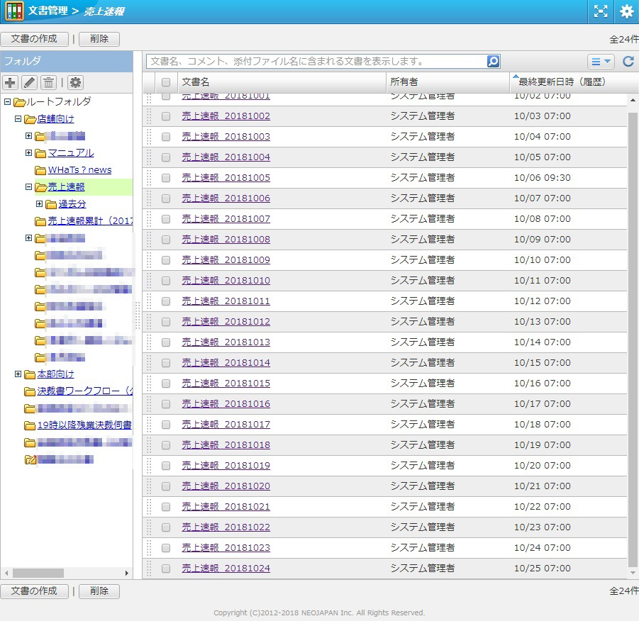 全店舗の売上速報を自動アップロードできるようにしています。まず、各店舗のPOSレジからPOSサーバーに売上データが随時アップロードされ、POSサーバー上の売上データから売上げ速報の帳票を自動作成します。その帳票が添付ファイルとして専用アカウントに送信されるとdesknet's NEOが取り込み、文書管理に登録保管する仕組みです。