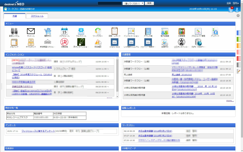 それらの課題を克服するためにdesknet's NEOを導入。 [ワークフロー]の活用による承認申請・決裁の迅速化、全店の売上げ速報配信や資材発注の省力化による店舗業務の負荷軽減など、情報共有の大規模な転換を一気に進めました。