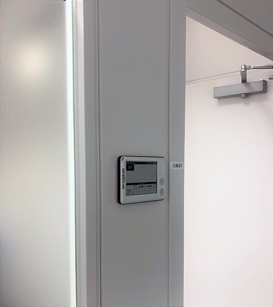 オプションも使わせてもらっています。同システムは、会議室の出入り口に会議室の使用状況がわかる電子ペーパーの表示機を貼りつけて、会議室管理を効率化するツールです。弊社は、業務フロアと会議室フロアが完全に分かれていますので、このシステムは便利でした。[設備予約]で予約されている会議室に、実際に行ってみると、実は会議室が使われていなかった、ということはよくあります。そういった“空予約”を防ぐのに電子ペーパーシステムが役立っています。以前であれば、「本当に使われているの?」を確認するのに、いちいち階段を上り下りして会議室の使用状況を確認していたのが、同システムによって、自席に居ながら確認可能になりました。