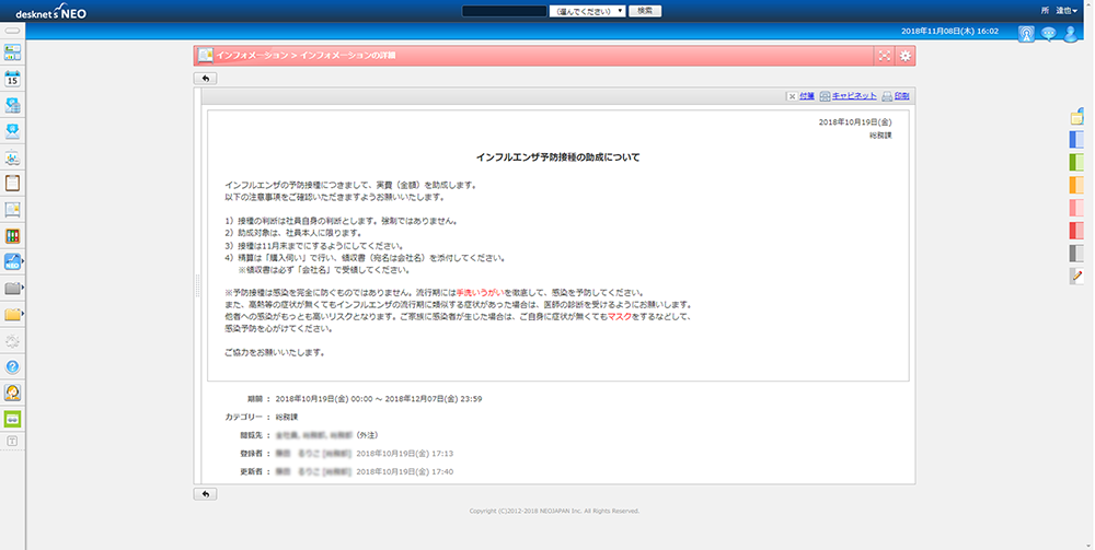 「チームワークの強化」については、desknet's NEOもそうなのですけれど、御社のビジネスチャットChatLuckも活躍しています。ChatLuckで気軽なメッセージ交換が加速したことで、社内の連携にミスや漏れがなくなり、チームワークも向上しました。ChatLuckでスムーズなコミュニケーションをとりつつ、情報に「重み」をもたせて発信したいことがらはNEOの[インフォメーション]などを使う。desknet's NEOとChatLuckの使い分けは特にルール化していませんが、うまく併用できています。desknet's NEOの機能性によって、弊社の仕事がスピーディに、スムーズになりました。特に、細かな事務手続きや他人に了承を得たり、確認作業を行ったりするような、いわゆる「名前のない」タスクの効率化が実現しました。