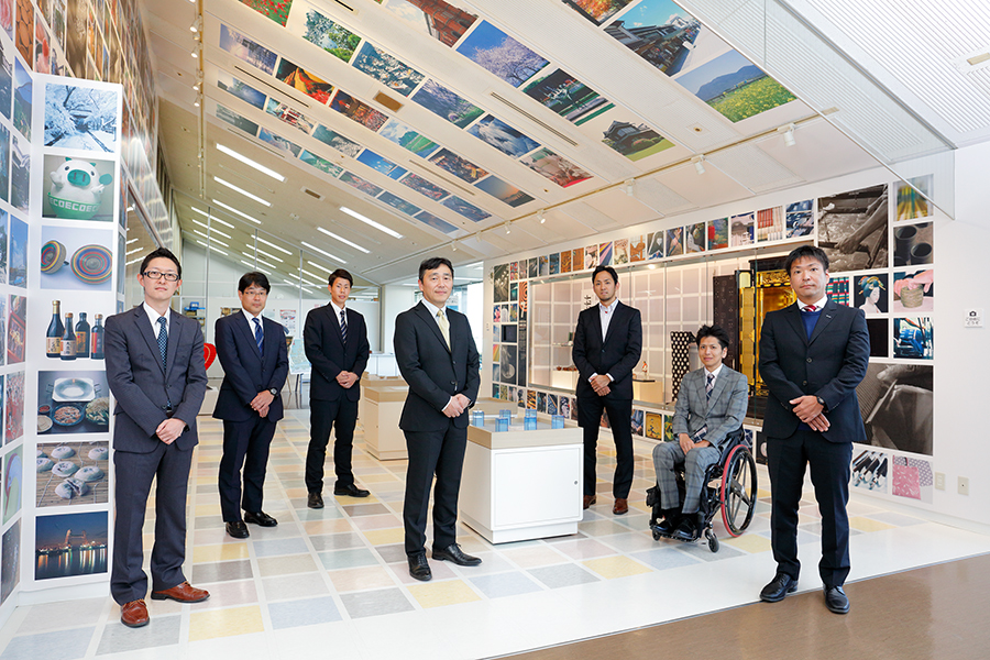 東公園や玄界灘を見下ろす県庁最上階で、県の物産を展示する「福岡よかもんひろば」。伝統工芸品常設展示「てしごとんねる」では、福岡県が誇る国・県指定の伝統工芸、観光地など各市町村の魅力が紹介されています。