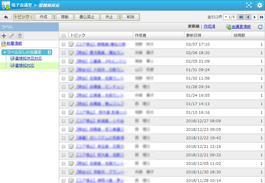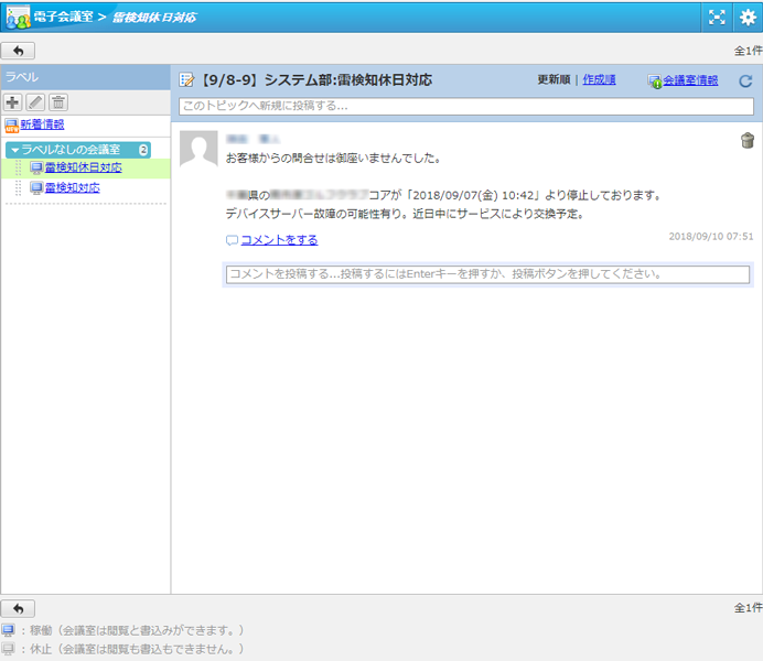 当社が提供する「雷検知システム」はリアルタイムで雷・降雨リスクを予報するシステムでゴルフ場を中心にイベント会場などの安全管理にも活用されています。特にゴルフ場はオンシーズンの休日などに運用上の問い合わせが多く、専用フリーダイアルを開設しているのですが、その対応記録を電子会議室に記録し、管理・共有しています。
