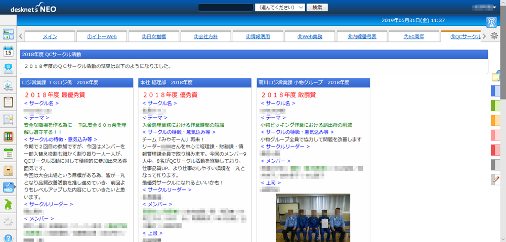 ポータルの「QCサークル活動」ではチームごとの取り組みや進捗状況をつぶさに共有し合い、時にはリーダーや上職者がアドバイスを加え「QCサークル大会」の発表・受賞までの過程を全社共有しています。