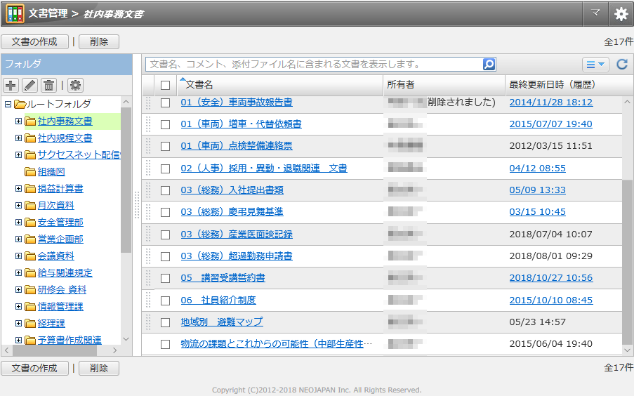 [文書管理]は各種規程や月次資料などの全社共有文書のほか、部課などの組織やプロジェクトごとに管理しているものもあります。