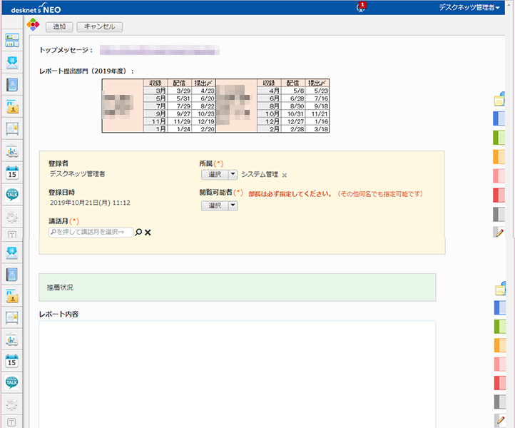 Notesで実施していたことを最適化したかったのです。たとえば会長や社長が発信したメッセージに対し、各社員が感想等をレポートにし、登録するシステムがありました。その内容について上層部も返信をするなど、上下間でインタラクティブなやりとりをしていた。AppSuiteなら、そういった環境がつくれます(※写真①)し、アクセス権の設定でやりとりもクローズドな状態にできます。また、「これは」といった社員の建設的な意見は上層部の裁量ですぐグループ公開もできる。そういった操作はdesknet's NEOの標準機能では実現が難しかったので、AppSuiteで環境づくりを進めています。
