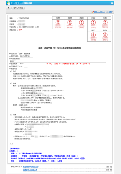 「出張旅費精算」「購入・接待の伺書」「各種稟議書」「企画改善」「得意先管理」をはじめ16帳票の運用をすぐに開始しました。[ワークフロー]はどこで滞留しているかすぐにわかり、案件ごとにコメントが残せ、差し戻しができる点を評価しています。特に重要な依頼案件などで申請後の経過確認が必要なものは、複写して新規作成という手法で逆に流す「再申請」の手法で、業務の結果報告が必ず返るようにしています。