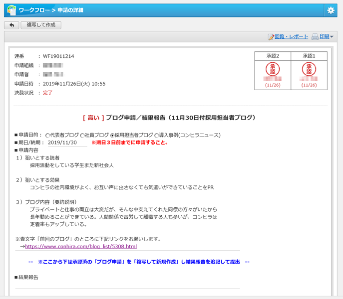 「ブログ申請」は[ワークフロー]に初稿原稿を添付して、記述内容や表現の不備がないか確認、校正を行い、チェック工程終了後にコンテンツ担当者が予約登録。登録確定後はブログ執筆者がアップ日に[回覧・レポート]で、ブログのねらい、ターゲットなどを社内告知します。そこで社員が一斉に見るので閲覧カウントが増えるのと同時に、記事内容に対する社員のコメントも交わして、実務上関係が希薄な担当者間のコミュニケーション、ナレッジ共有が行われています。