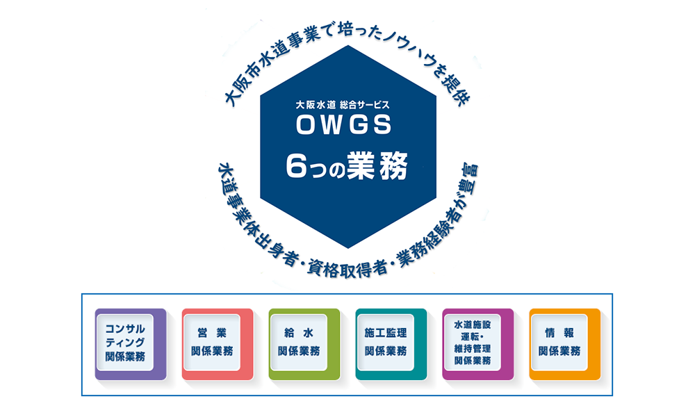 - 大阪市水道局の監理団体として各自治体から業務を受託。水道に関する総合的な技術や運用ノウハウを活かして、水道運営に係わるあらゆる業務を多くの自治体に提供。水道事業に関する「コンサルティング」「営業」「給水」「施工監理」「水道施設運転・維持管理」「情報」の6つの業務を柱に、各自治体のニーズに合わせた組み合わせ自由、オーダーメイドの包括的な水道業務を提供している。