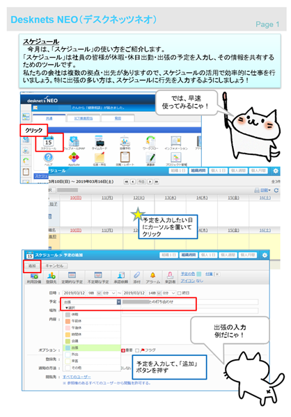 どのような目的で業務に使うのか。社内報にイラストも交えたわかりやすい「desknet's NEO使い方紹介」シートなども載せて、基本的な操作方法などの社員教育を実施しました。