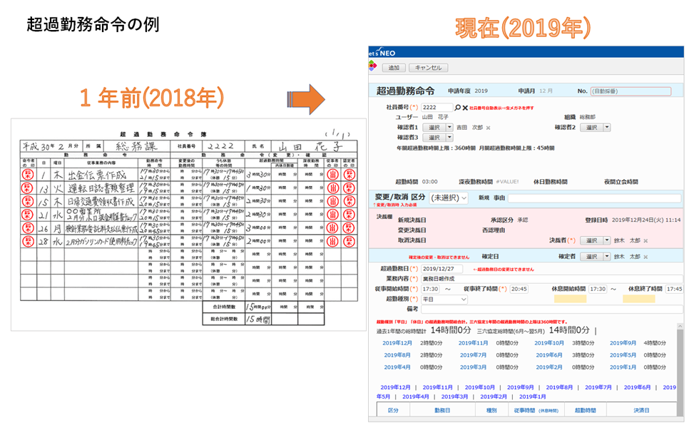 特に問題視していたのは、各事業所からの勤怠申請書類提出は1カ月単位であったため、超過勤務命令から、事業所の勤務状況や現場の負荷がどの程度のものかリアルタイムで分析できなかったことです。電子化すれば、特定事業所に超過勤務が多く負荷がかかっているなどの現状把握ができ、人員を補う対応も即時判断できます。