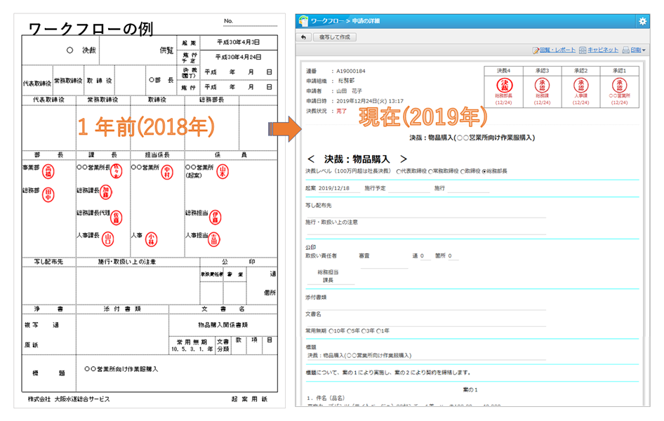 紙からの脱却とグループウェアのワークフロー活用による電子化の推進です。