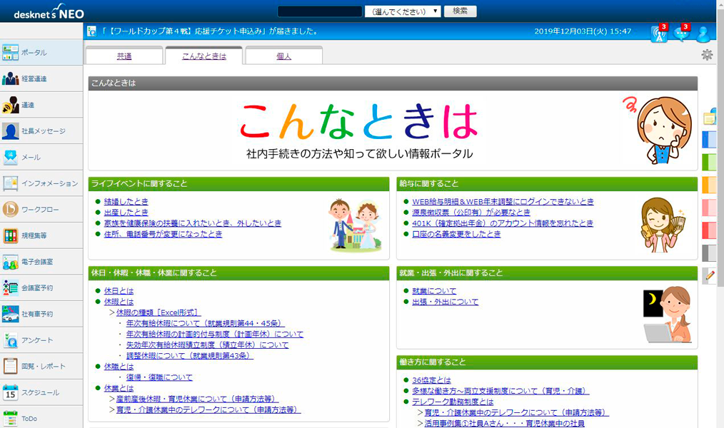 個人ポータルはニーズもあり、もちろん活用していますが、組織ポータルにも便利さを感じています。例えば「こんなときは」という名のポータルをつくりました。社内の事務手続き、たとえば結婚、出産、転居時やテレワークなどの申請手順などがまとまったページです。それらに関する問い合わせが日常的に多く、担当部署にかなりの負荷があったのです。そこで我々情報システム部から組織ポータル機能を紹介しました。最終的には担当者レベルでコンテンツを作成し、完成した「こんなときは」ポータルが活躍。おかげさまで事務的な問い合わせが大きく減少しました。